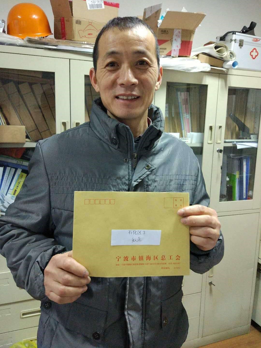 百隆旗下染厂困难员工唐义虎收到了地方总工会送来的慰问金