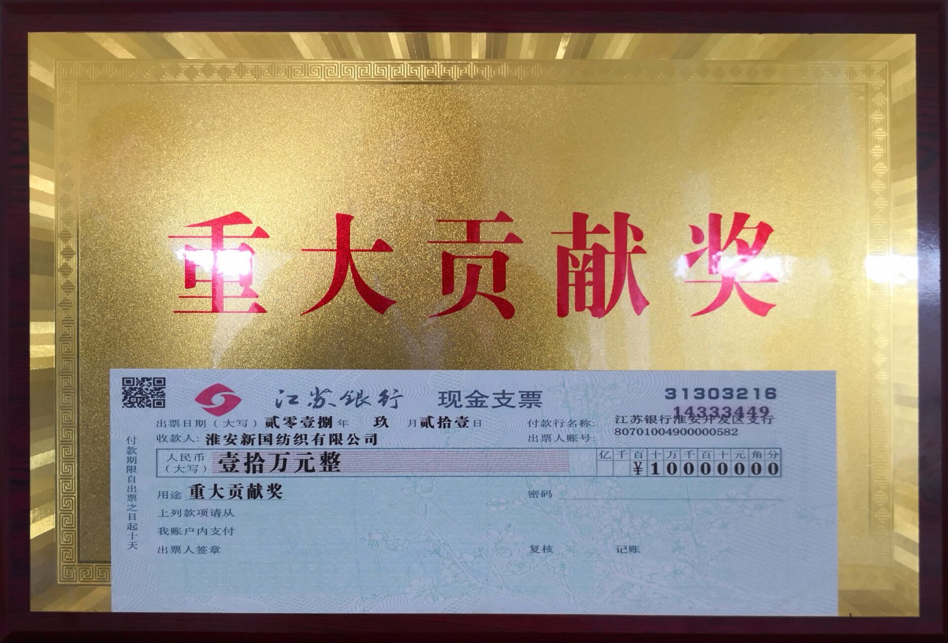 2018年9月21日,在淮安市召开的淮安经济技术开发区经济发展大会上,淮安新国纺织有限公司荣获了重大贡献奖并获得奖金壹拾万元整。